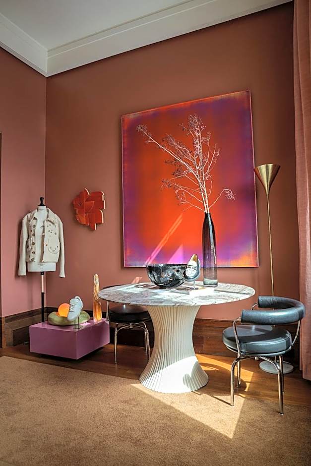 This spacious suite offers a separate living area, including a dining or conference table. Colors and patterns extend from the selected Dutch Master's painting into the room, and double-glazed windows offer views of Amsterdam’s historic city center as well as views of the Amstel River. A balcony is available in some of the Prestige suites.